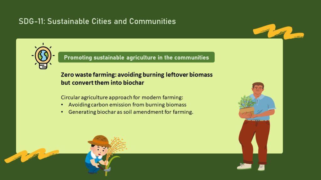 • Circular economy approach: removing biomass burning activity, instead converting leftover biomass into biochar which can be utilized as soil amendment to improve the soil fertility.