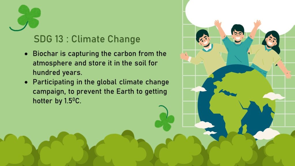 • Biochar application means reducing the amount of carbon dioxide in the air and participating in the global climate change campaign, to prevent the Earth to getting hotter by 1.50C.